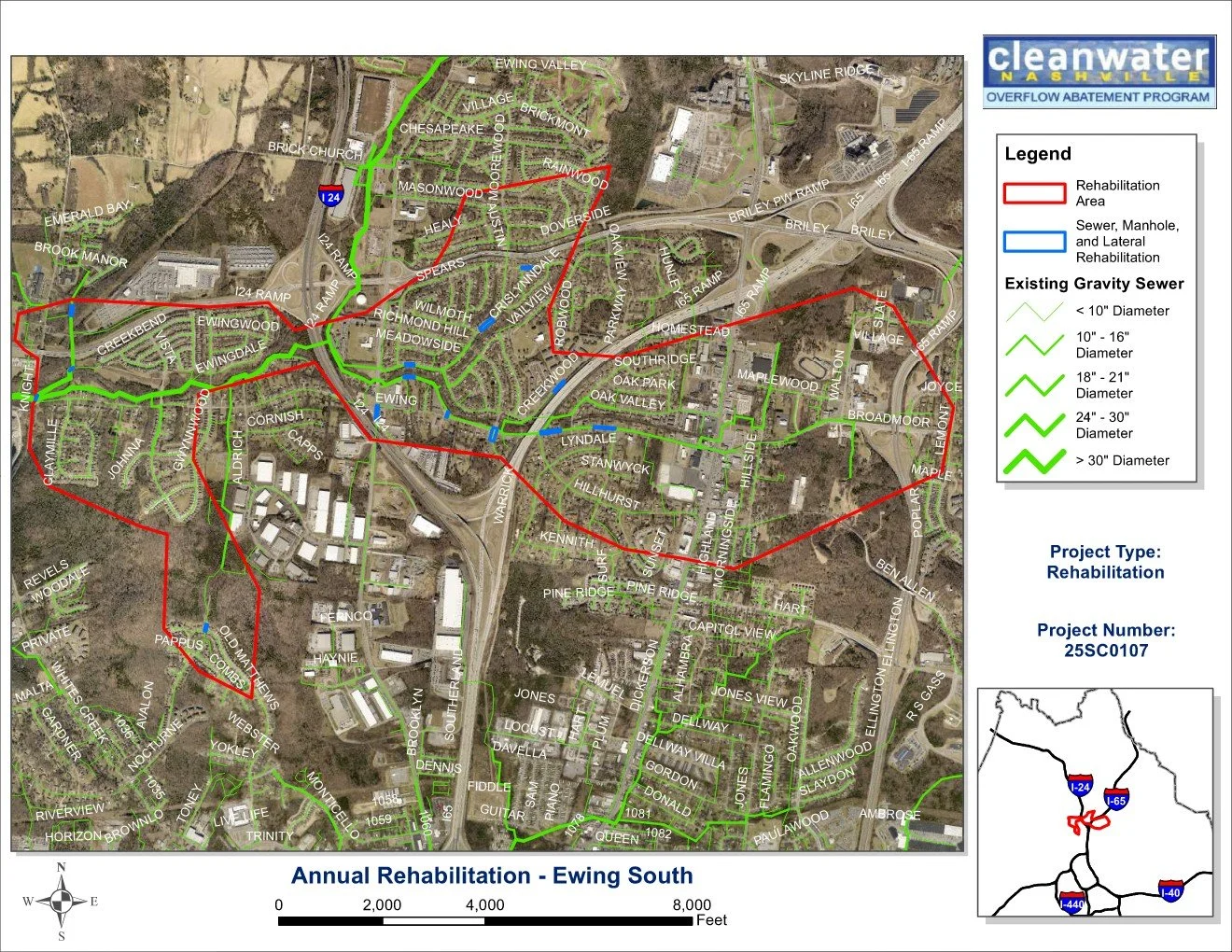 Construction begins this week on the Annual Rehabilitation - Ewing South project. This project was identified to reduce wet-weather flows within the sewer system by addressing observed sources of infiltration and inflow through sewer rehabilitation. It also considers nearby sewers for inclusion in the project based on their condition, the likelihood of water migration to adjacent sewers, and the impact to customers. Work consists of the rehabilitation of approximately 3,340 linear feet of existing sewer lines by cured-in-place-pipe lining, and approximately 55 manholes will be rehabilitated. The project also entails extensive inspection, testing, and renewal of over 1000 service laterals, in addition to other miscellaneous sewer-related work.